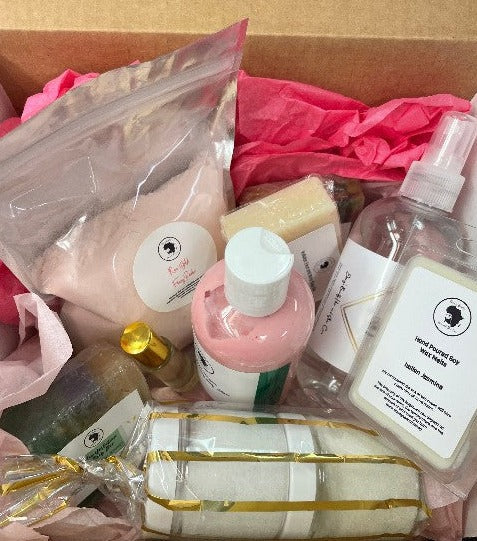 All items are made with organic ingredients and are safe for sensitive skin. Each box contains 8 to 10 full-sized items, and each box is different so be prepared for a surprise! 📦🎉 All boxes may contain hair care products, skin care products, feminine care products, and candles.